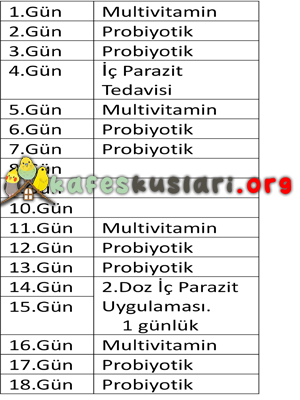 > Üstteki tablo bir kuşa ilk defa iç parazit uygulanacağı zaman yapılır. İlk uygulamadan, 45-60 gün sonra yapılacak sonraki iç parazit uygulamaları sadece 1 gün olarak, tek doz yapılır. 10-12 gün sonra tekrar dozuna gerek yoktur.